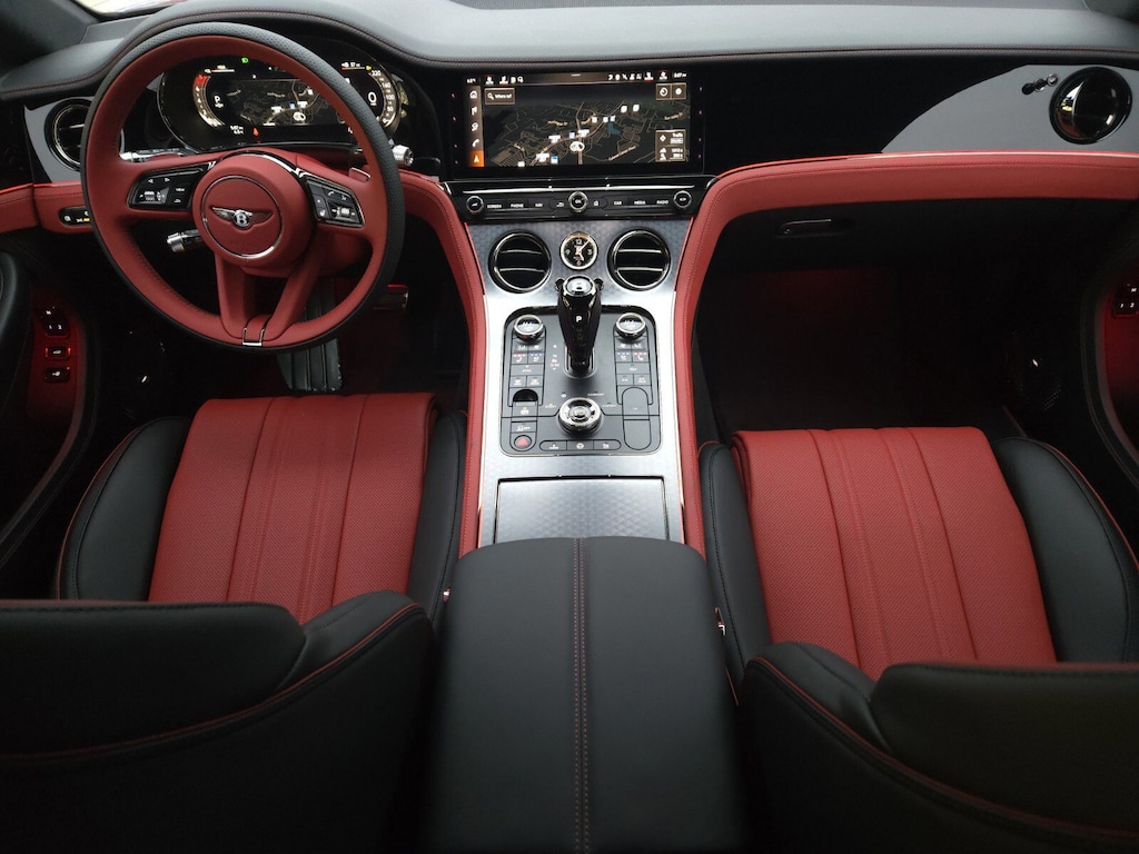 Inside, the cabin blends **Hotspur Main Hide** with **Beluga Secondary Hide**, creating a bold two-tone environment elevated by Piano Black surfaces and dark-tinted aluminum highlights. Every inch of the interior is curated to Bentleys artisan standard.